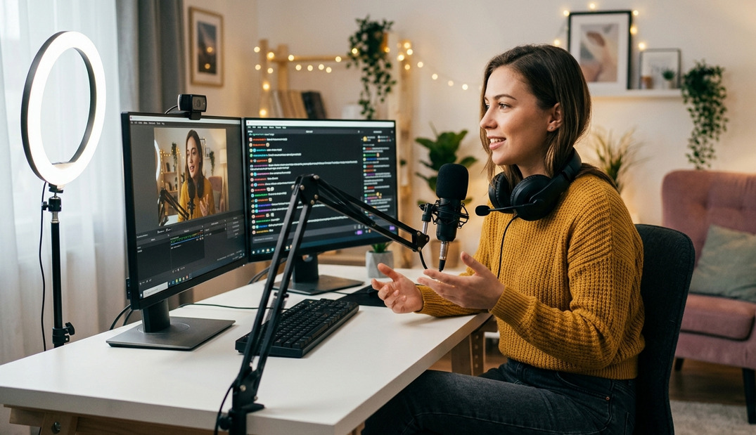 A webcam model provides live video content, interacts with her viewers, and makes money through tips, subscriptions, and private video sessions.