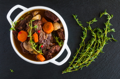 The slow-cooking process takes several hours to ensure the meat is tender and absorbs all the flavors of the spices and vegetables.